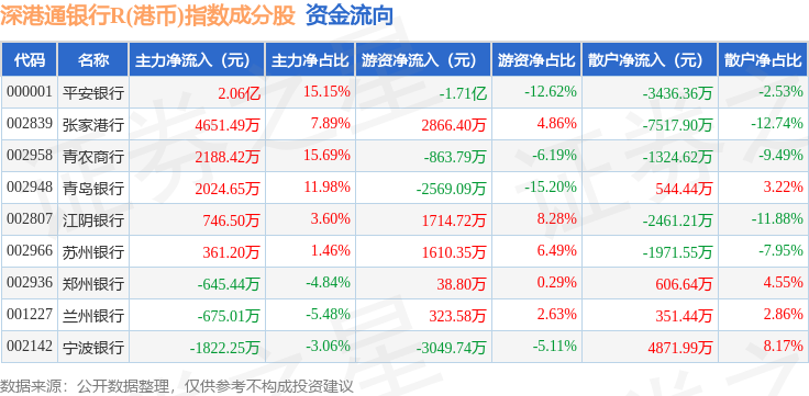 资金流向方面,深港通银行R(港币)(483082)指数成份股当日主力资金净流入合计2.74亿元,游资资金净流出合计1.71亿元,散户资金净流出合计1.03亿元。成份股资金流向详情见下表:
