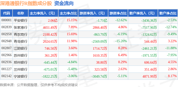 资金流向方面,深港通银行R(483081)指数成份股当日主力资金净流入合计2.74亿元,游资资金净流出合计1.71亿元,散户资金净流出合计1.03亿元。成份股资金流向详情见下表: