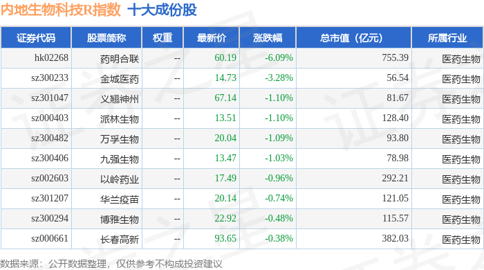 资金流向方面,内地生物科技R(483101)指数成份股当日主力资金净流入合计3.03亿元,游资资金净流出合计4.55亿元,散户资金净流入合计1.53亿元。成份股资金流向详情见下表: