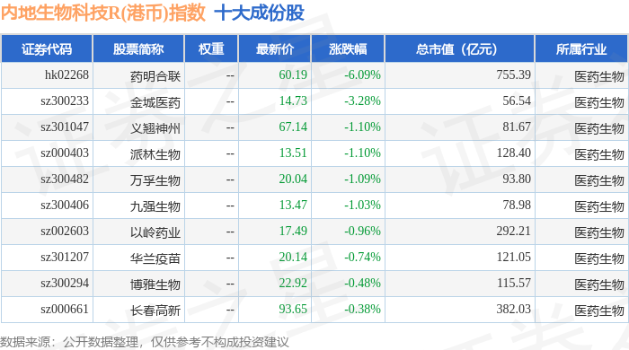 内地生物科技R(港币)(483102)指数十大成份股详情如下: