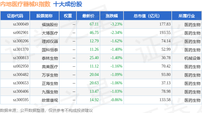 内地医疗器械R(483103)指数十大成份股详情如下: