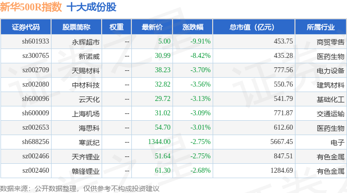 证券之星消息,12月12日,新华500R(489001)指数报收于7458.79点,涨0.75%,成交7341.65亿元,换手率0.81%。当日该指数成份股中,上涨的有343家,中国西电以10.06%的涨幅领涨,下跌的有137家,永辉超市以9.91%的跌幅领跌。