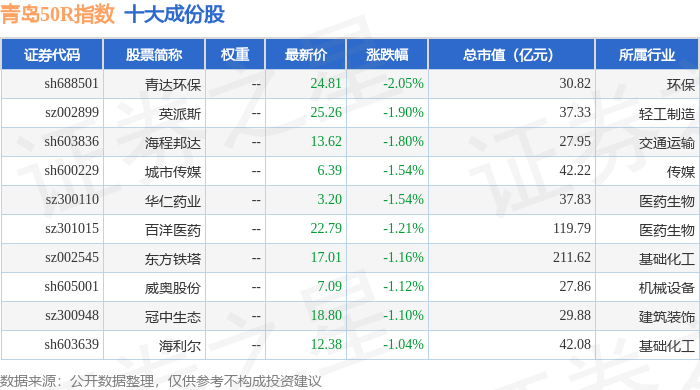 青岛50R(489011)指数十大成份股详情如下: