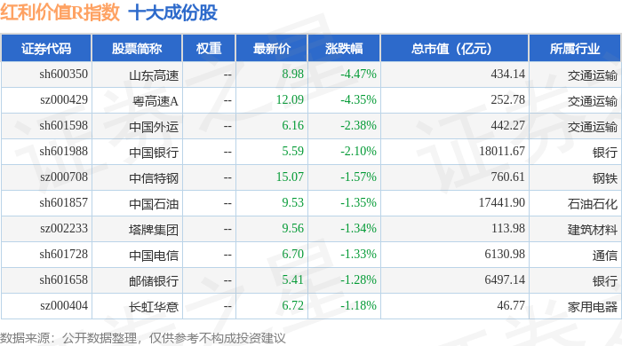 资金流向方面,红利价值R(489016)指数成份股当日主力资金净流出合计6279.36万元,游资资金净流出合计3.13亿元,散户资金净流入合计3.76亿元。成份股资金流向详情见下表: