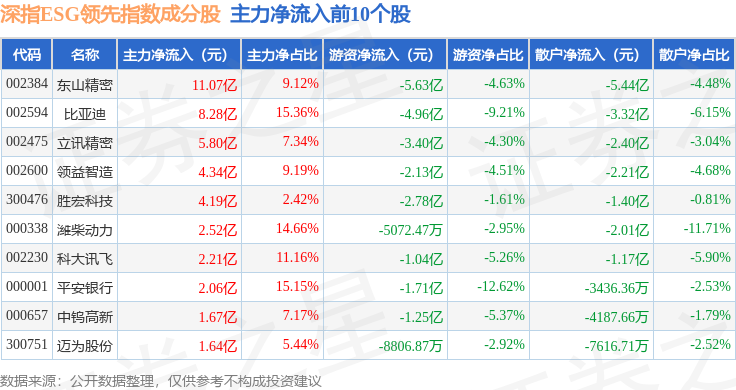 资金流向方面,深指ESG领先(970029)指数成份股当日主力资金净流出合计26.42亿元,游资资金净流出合计21.8亿元,散户资金净流入合计48.22亿元。成份股资金流向详情见下表: