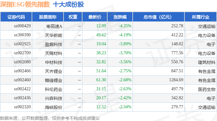 证券之星消息,12月12日,深指ESG领先(970029)指数报收于14063.68点,涨0.72%,成交2877.64亿元,换手率1.58%。当日该指数成份股中,上涨的有137家,东山精密以7.75%的涨幅领涨,下跌的有57家,粤高速A以4.35%的跌幅领跌。