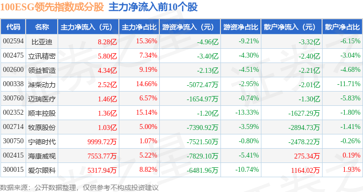 资金流向方面,100ESG领先(970030)指数成份股当日主力资金净流出合计32.09亿元,游资资金净流入合计6845.75万元,散户资金净流入合计31.41亿元。成份股资金流向详情见下表: