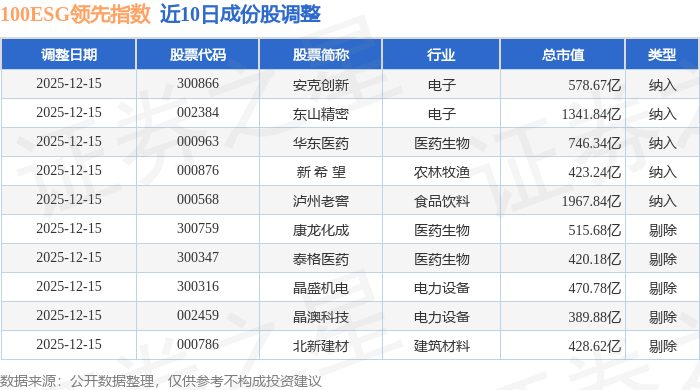 近10日内100ESG领先(970030)指数成份股做了调整,新纳入了5只股票,剔除了5只股票。