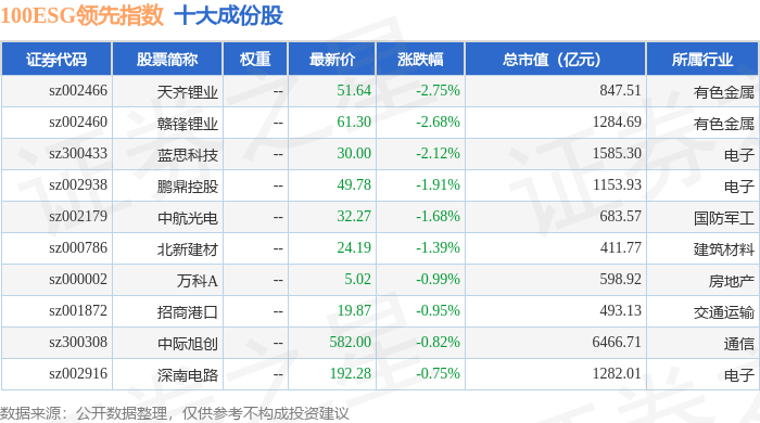 100ESG领先(970030)指数十大成份股详情如下: