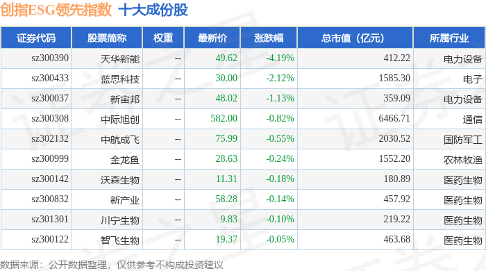 创指ESG领先(970031)指数十大成份股详情如下: