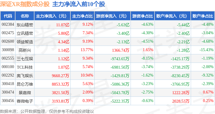 资金流向方面,深证XR(970046)指数成份股当日主力资金净流出合计3.59亿元,游资资金净流出合计9.46亿元,散户资金净流入合计13.05亿元。成份股资金流向详情见下表: