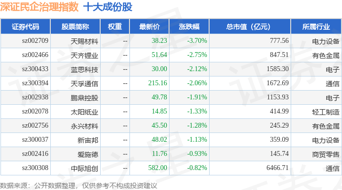 证券之星消息,12月12日,深证民企治理(970058)指数报收于2036.64点,涨0.94%,成交1376.25亿元,换手率1.93%。当日该指数成份股中,上涨的有36家,蓝晓科技以12.69%的涨幅领涨,下跌的有13家,天赐材料以3.7%的跌幅领跌。