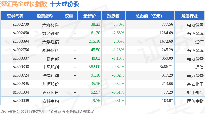 证券之星消息,12月12日,深证民企成长(970071)指数报收于4018.97点,涨0.83%,成交1405.24亿元,换手率2.51%。当日该指数成份股中,上涨的有39家,蓝晓科技以12.69%的涨幅领涨,下跌的有10家,天赐材料以3.7%的跌幅领跌。