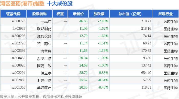 湾区医药(港币)(980014)指数十大成份股详情如下: