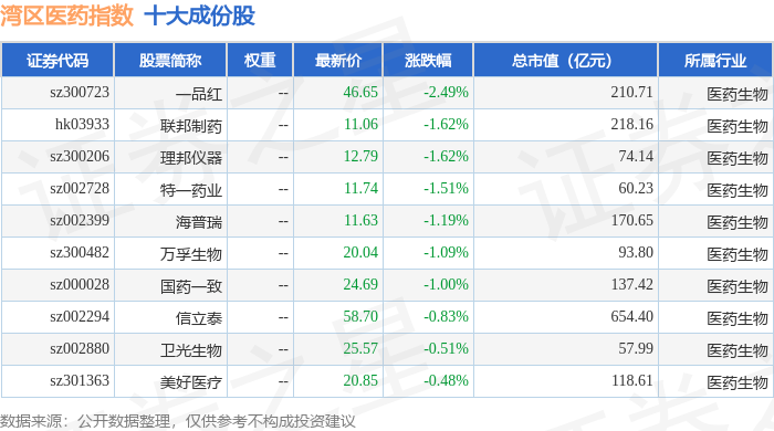 证券之星消息,12月12日,湾区医药(980013)指数报收于1912.63点,涨0.98%,成交85.51亿元,换手率0.85%。当日该指数成份股中,上涨的有15家,康方生物以6.05%的涨幅领涨,下跌的有13家,一品红以2.49%的跌幅领跌。