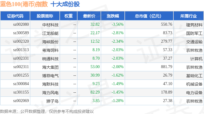 蓝色100(港币)(980069)指数十大成份股详情如下: