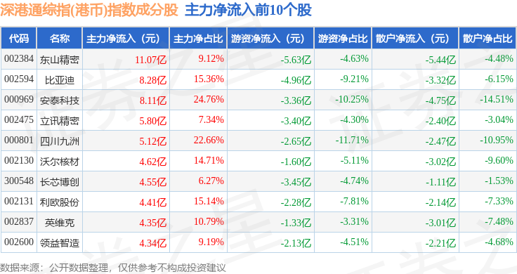 资金流向方面,深港通综指(港币)(983006)指数成份股当日主力资金净流出合计56.86亿元,游资资金净流出合计89.59亿元,散户资金净流入合计146.45亿元。成份股资金流向详情见下表: