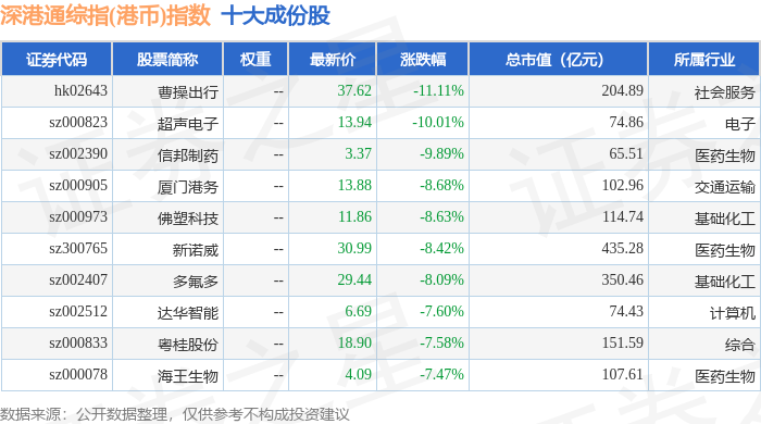深港通综指(港币)(983006)指数十大成份股详情如下: