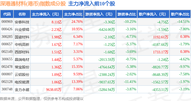 资金流向方面,深港通材料(港币)(983016)指数成份股当日主力资金净流出合计6.92亿元,游资资金净流出合计8.72亿元,散户资金净流入合计15.64亿元。成份股资金流向详情见下表: