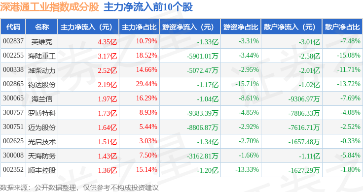 资金流向方面,深港通工业(983017)指数成份股当日主力资金净流出合计20.2亿元,游资资金净流出合计20.11亿元,散户资金净流入合计40.3亿元。成份股资金流向详情见下表: