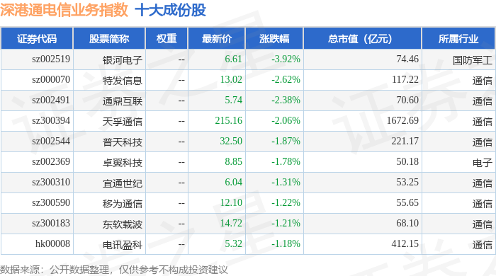 证券之星消息,12月12日,深港通电信业务(983029)指数报收于10656.94点,涨1.24%,成交1433.52亿元,换手率2.02%。当日该指数成份股中,上涨的有48家,联特科技以15.87%的涨幅领涨,下跌的有25家,银河电子以3.92%的跌幅领跌。