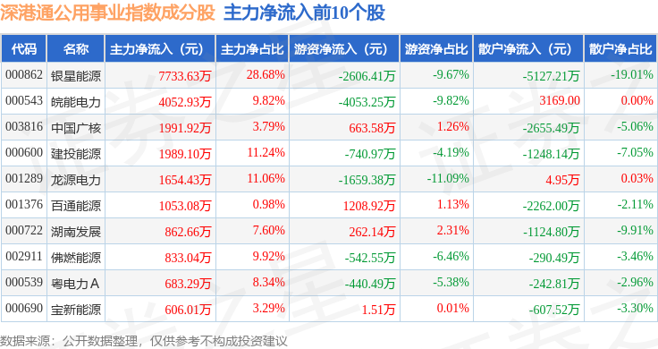 资金流向方面,深港通公用事业(983031)指数成份股当日主力资金净流入合计6822.41万元,游资资金净流出合计5586.39万元,散户资金净流出合计1236.02万元。成份股资金流向详情见下表: