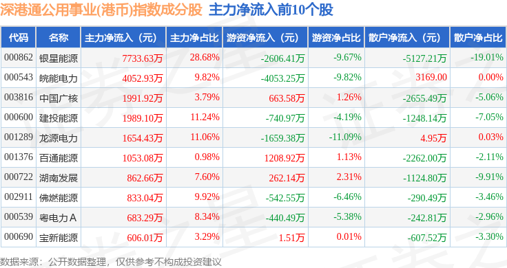 资金流向方面,深港通公用事业(港币)(983032)指数成份股当日主力资金净流入合计6822.41万元,游资资金净流出合计5586.39万元,散户资金净流出合计1236.02万元。成份股资金流向详情见下表: