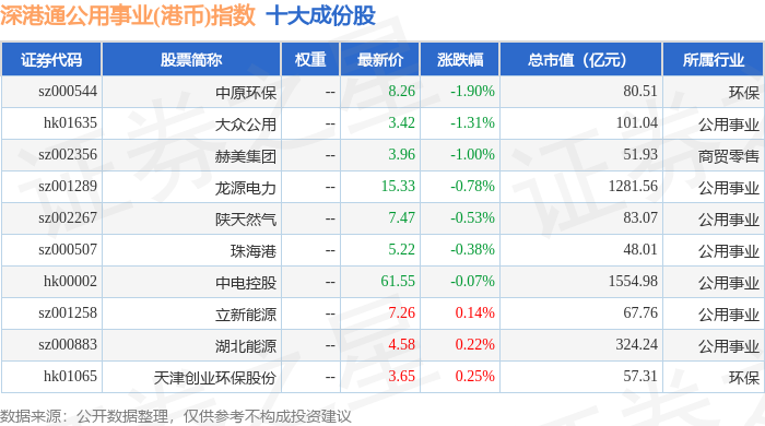 深港通公用事业(港币)(983032)指数十大成份股详情如下: