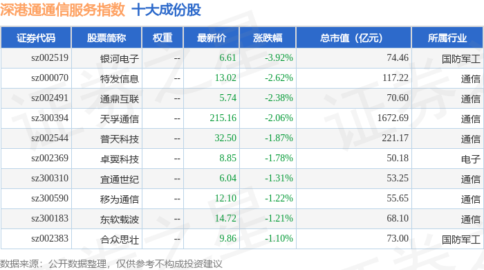 证券之星消息,12月12日,深港通通信服务(983033)指数报收于12625.08点,涨1.47%,成交1386.29亿元,换手率4.15%。当日该指数成份股中,上涨的有39家,联特科技以15.87%的涨幅领涨,下跌的有23家,银河电子以3.92%的跌幅领跌。