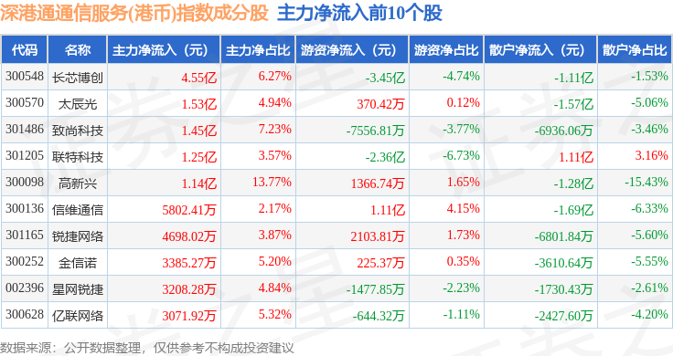 资金流向方面,深港通通信服务(港币)(983034)指数成份股当日主力资金净流出合计24.59亿元,游资资金净流入合计7.89亿元,散户资金净流入合计16.7亿元。成份股资金流向详情见下表: