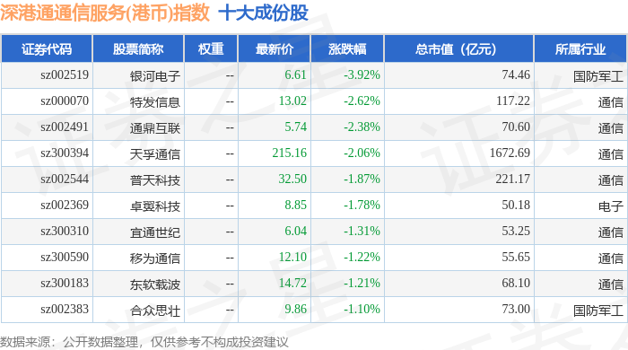 深港通通信服务(港币)(983034)指数十大成份股详情如下: