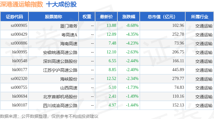 资金流向方面,深港通运输(983077)指数成份股当日主力资金净流入合计3.94万元,游资资金净流出合计5046.32万元,散户资金净流入合计5042.38万元。成份股资金流向详情见下表: