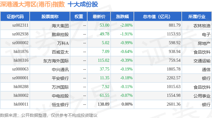深港通大湾区(港币)(983090)指数十大成份股详情如下: