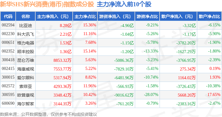 资金流向方面,新华SHS新兴消费(港币)(989007)指数成份股当日主力资金净流入合计10.25亿元,游资资金净流出合计11.08亿元,散户资金净流入合计8281.45万元。成份股资金流向详情见下表:
