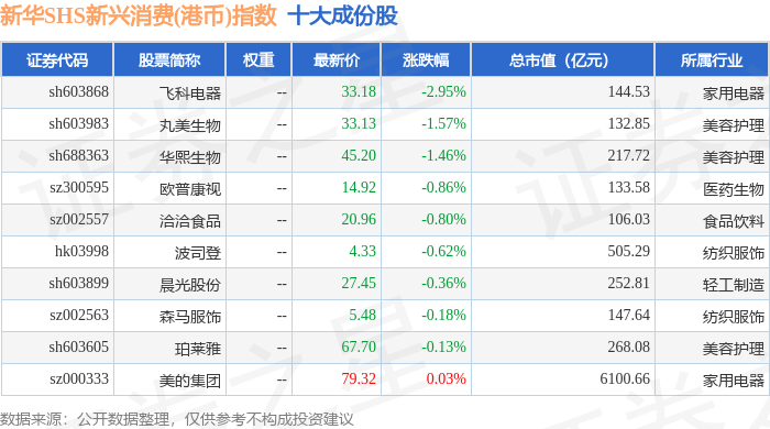 新华SHS新兴消费(港币)(989007)指数十大成份股详情如下: