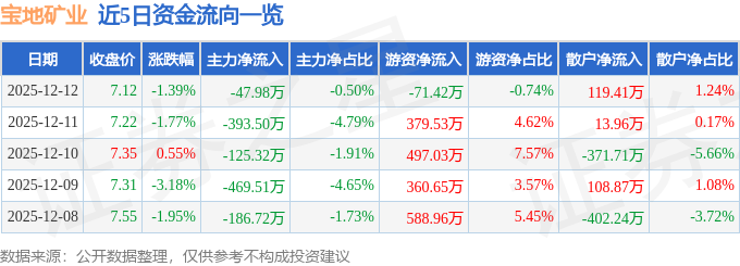 证券之星消息,截至2025年12月12日收盘,宝地矿业(601121)报收于7.12元,下跌1.39%,换手率3.52%,成交量13.36万手,成交额9641.11万元。