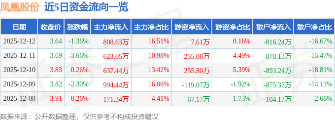 证券之星消息,截至2025年12月12日收盘,凤凰股份(600716)报收于3.64元,下跌1.36%,换手率1.42%,成交量13.29万手,成交额4897.78万元。