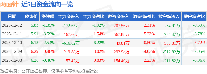 12月12日的资金流向数据方面,主力资金净流出172.65万元,占总成交额1.92%,游资资金净流入207.56万元,占总成交额2.31%,散户资金净流出34.91万元,占总成交额0.39%。
