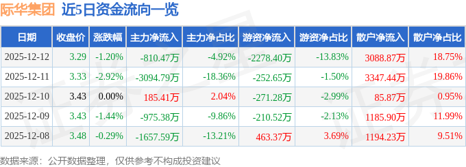 证券之星消息,截至2025年12月12日收盘,际华集团(601718)报收于3.29元,下跌1.2%,换手率1.13%,成交量49.74万手,成交额1.65亿元。