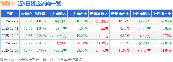 证券之星消息,截至2025年12月12日收盘,海利尔(603639)报收于12.38元,下跌1.04%,换手率0.46%,成交量1.55万手,成交额1928.65万元。