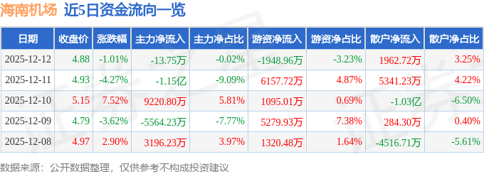 证券之星消息,截至2025年12月12日收盘,海南机场(600515)报收于4.88元,下跌1.01%,换手率1.35%,成交量124.1万手,成交额6.04亿元。