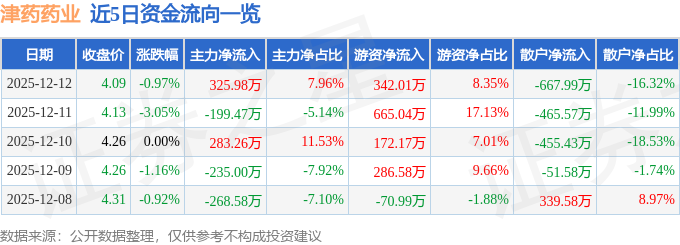 证券之星消息,截至2025年12月12日收盘,津药药业(600488)报收于4.09元,下跌0.97%,换手率0.91%,成交量9.94万手,成交额4094.23万元。