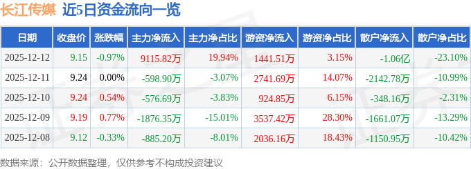 证券之星消息,截至2025年12月12日收盘,长江传媒(600757)报收于9.15元,下跌0.97%,换手率4.12%,成交量50.01万手,成交额4.57亿元。
