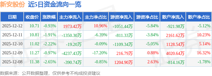 12月12日的资金流向数据方面,主力资金净流入1973.42万元,占总成交额10.96%,游资资金净流出1051.44万元,占总成交额5.84%,散户资金净流出921.98万元,占总成交额5.12%。