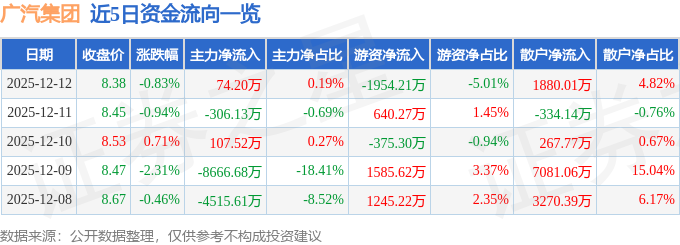 证券之星消息,截至2025年12月12日收盘,广汽集团(601238)报收于8.38元,下跌0.83%,换手率0.63%,成交量46.42万手,成交额3.9亿元。