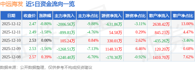 证券之星消息,截至2025年12月12日收盘,中远海发(601866)报收于2.47元,下跌0.8%,换手率0.84%,成交量82.0万手,成交额2.03亿元。