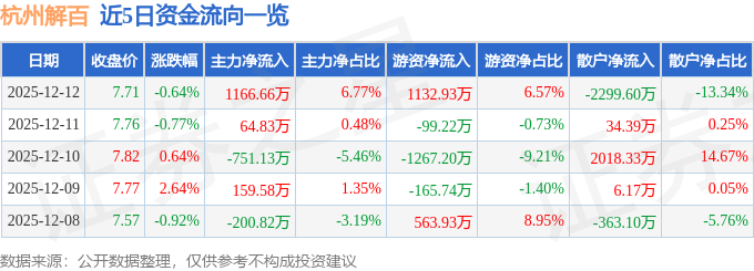 证券之星消息,截至2025年12月12日收盘,杭州解百(600814)报收于7.71元,下跌0.64%,换手率3.05%,成交量22.42万手,成交额1.72亿元。