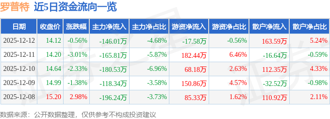 12月12日的资金流向数据方面,主力资金净流出146.01万元,占总成交额4.68%,游资资金净流出17.58万元,占总成交额0.56%,散户资金净流入163.59万元,占总成交额5.24%。