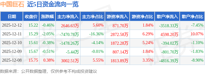 证券之星消息,截至2025年12月12日收盘,中国巨石(600176)报收于15.22元,下跌0.46%,换手率0.78%,成交量31.1万手,成交额4.73亿元。