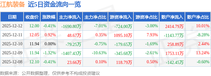 证券之星消息,截至2025年12月12日收盘,江航装备(688586)报收于12.0元,下跌0.41%,换手率2.54%,成交量20.12万手,成交额2.41亿元。